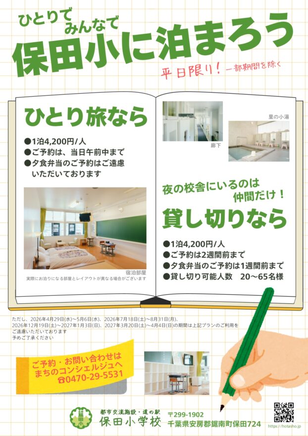 「ひとりで、みんなで保田小に泊まろう!」期間限定の宿泊プランを延長します!