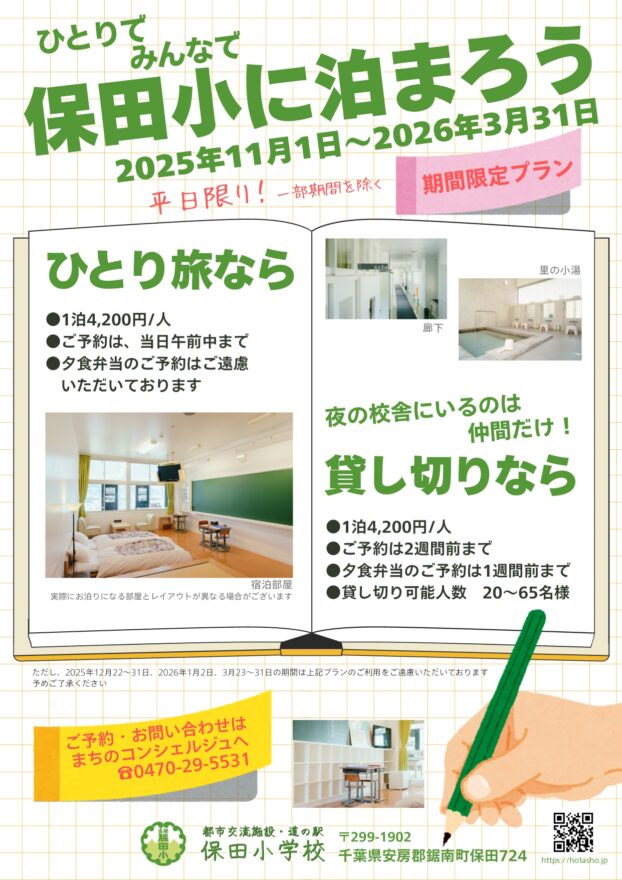 「ひとりで、みんなで保田小に泊まろう!」期間限定の宿泊プランがスタートします!!