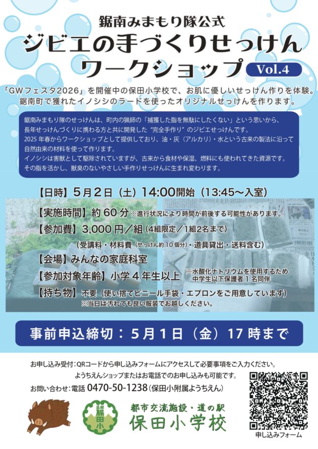 鋸南町でとれたイノシシのラードを使ったオリジナルせっけん作り体験です。